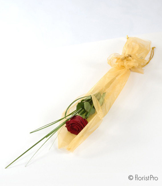 A single red rose with grasses, presented in a gift presentation fabric wrap